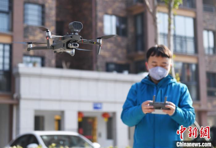 图为易金禹通过热成像无人机,为社区居民测量体温。 刘继刚 摄