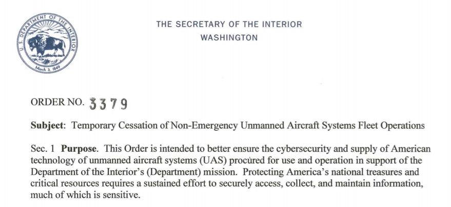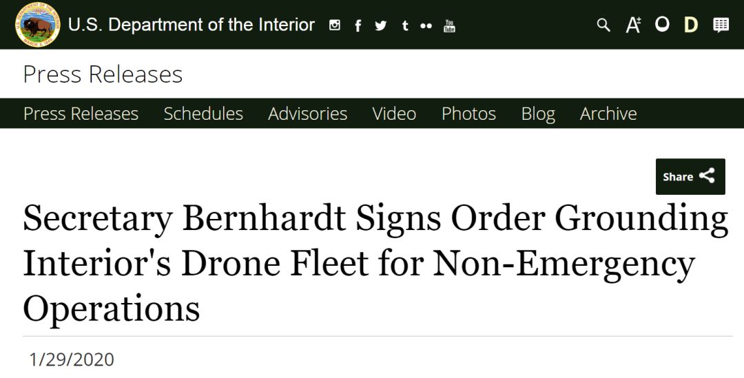 酷飞网编辑在美内政部官网浏览到一侧消息:当地时间1月29日,美国内政部长David Bernhardt签署了第3379号部长命令,确定暂停非紧急无人机系统的机队运行,涉及近1000架中国制或有中国制部件的无人机。