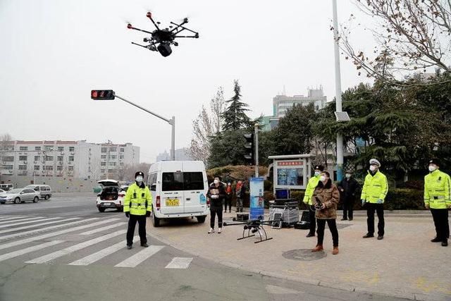 济南交警利用无人接喊话设备,提醒广大交通参与者,疫情期间外出应采取个人防护措施,并循环播放防疫标语。