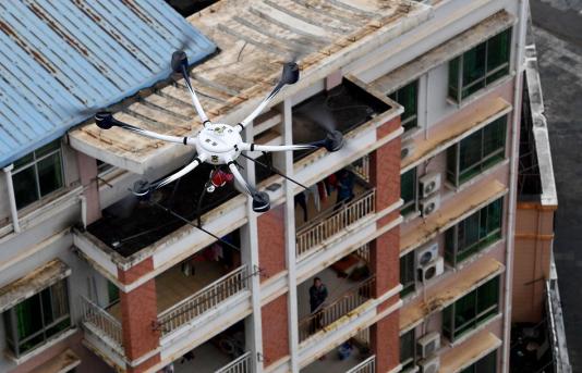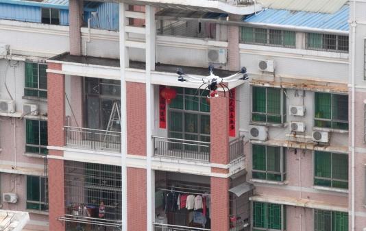 2月4日上午,南康城区上空一架无人机携带广播设备,正向市民们宣传疫情防控措施。这是南康区公安局根据当前疫情防控形势,出动警用无人机携带广播,参与新型冠状病毒感染的肺炎疫情防控。