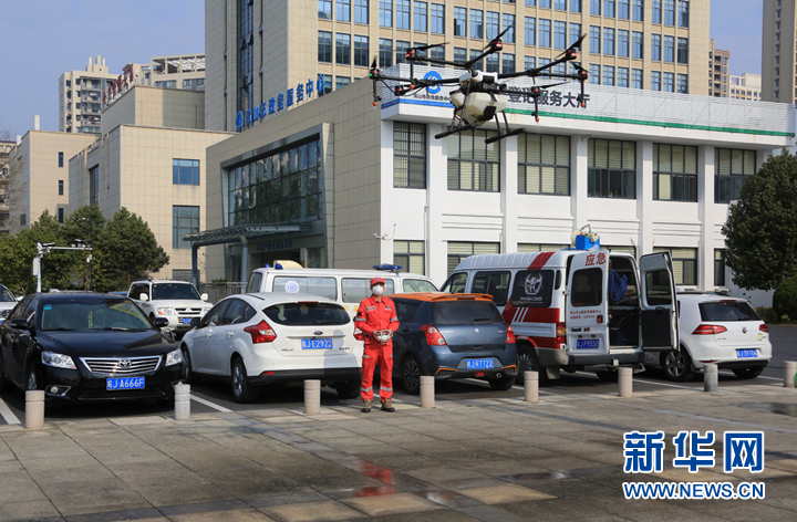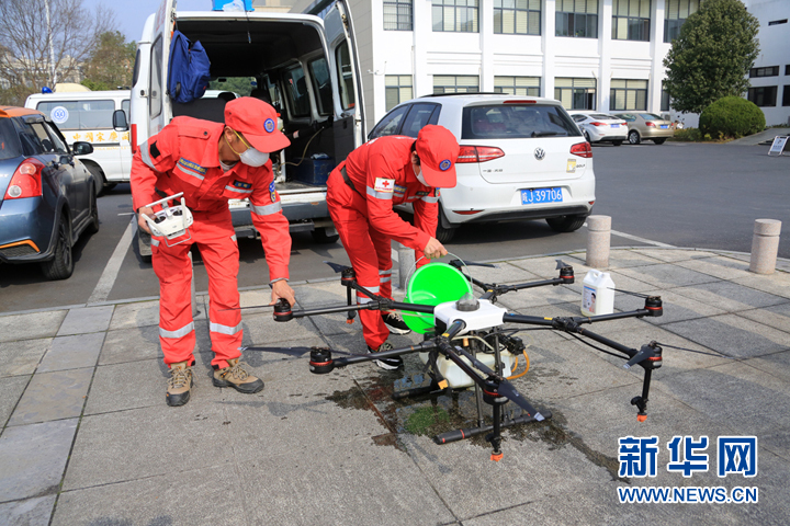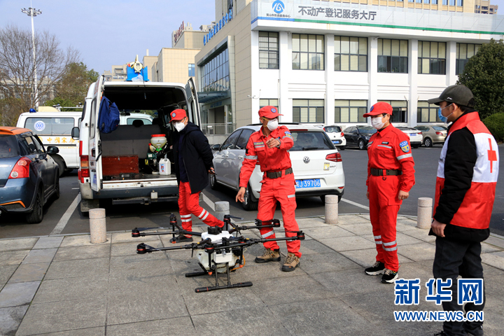 2月4日,黄山市山越应急救援中心的队员在公共区域用无人机喷洒消毒液。