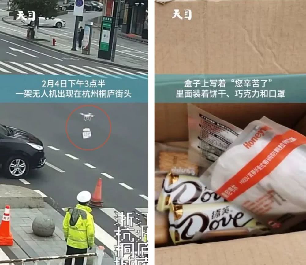 一个装有口罩、饼干的盒子从天而降,送到了交警手里后便完成使命离开。一句“您辛苦了”,让人心里暖暖的。▼