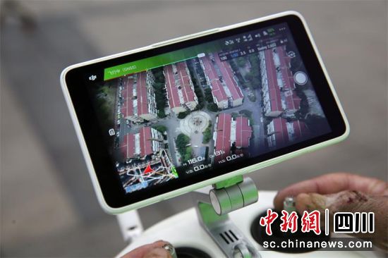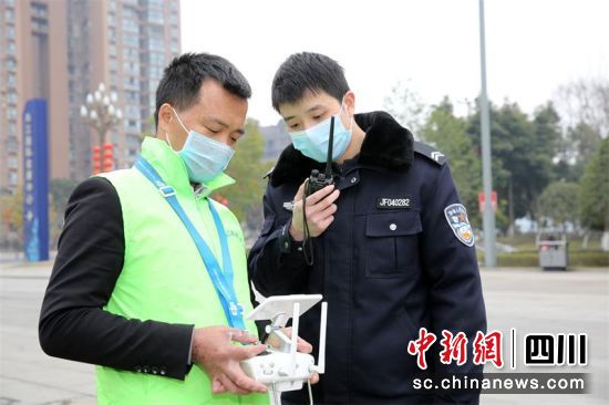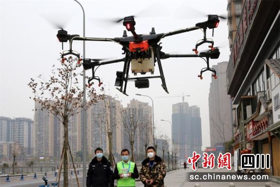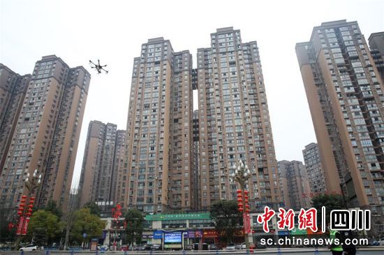 中新网四川新闻2月18日电 (兰自涛)2020年2月18日,在四川内江市东兴区西林街道,工作人员正在使用无人机开展空中疫情防控巡逻。
