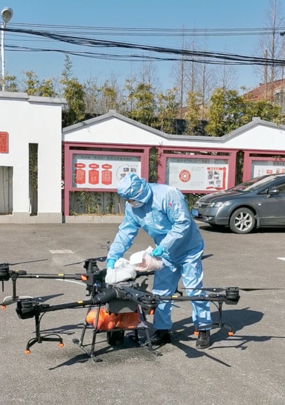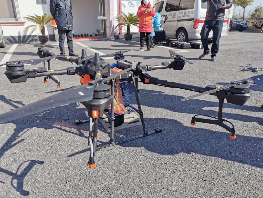 2月18日,上海市公安局治安总队会同奉贤区金汇镇政法委、奉贤分局齐贤派出所试点应用这款“迷你运20”,对辖区白沙村居的隔离重点人员投递了水果、蔬菜、肉类等食物,以及医用口罩、消毒液、洗手液等防疫物资,成功解决了该村配送人员不足的问题。