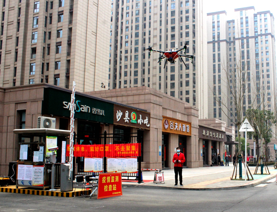 “各位居民请注意,本小区今日进行无人机免费消毒喷洒作业,大约需要30分钟时间,请大家关好门窗,收好衣物,不要出门。”2月24日,在郑东新区双湖花园小区,一架来自西华县无人机产业园的酷农无人机在小区上空利用机载喇叭一遍遍通知。