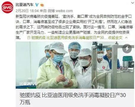 图:比亚迪医用级免洗手消毒凝胶日产30万瓶