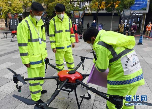 2月27日,远牧集团无人机志愿防疫队的无人机在昆明南屏街社区喷洒消毒液。 经主管部门批准,自2月10日以来,远牧集团无人机志愿防疫队与当地政府合作,每天出动8架无人机飞行在昆明市的公共活动区域,进行喷洒消杀。 新华社记者 杨宗友 摄