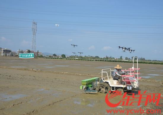 羊城晚报讯 记者彭纪宁,通讯员谭耀广、江讯、陈家协摄影报道:“嗡嗡嗡……”6架无人机一字排开来回在耕地上空盘旋,向田里喷洒药物和播种;“哒哒哒……”另一边农地上有几辆水田激光平地机、履带自走式旋耕机在来回穿梭平整着泥土;一辆水稻精量穴直播机也在平整好的地上播种稻谷种子……27日下午,开平市水口镇的一片农田上描绘着一幅现代机械化农业春耕图,开平市永晖农机专业合作社正给自己的400亩江门农机种植示范田进行春耕示范生产。