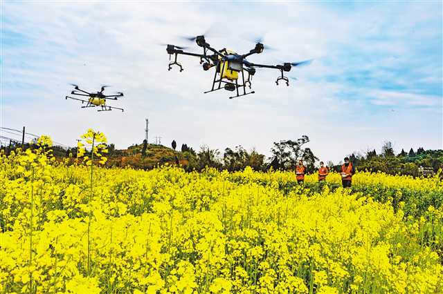 2月29日,大足区万古镇升斗村,植保无人机正在油菜地里作业。据了解,大足区年均植保面积48万亩,近年来通过引进推广节水、节药、高效的植保无人机等现代植保机械,与传统人工防治相比效率提高60倍以上,为农业丰产丰收打下坚实基础。