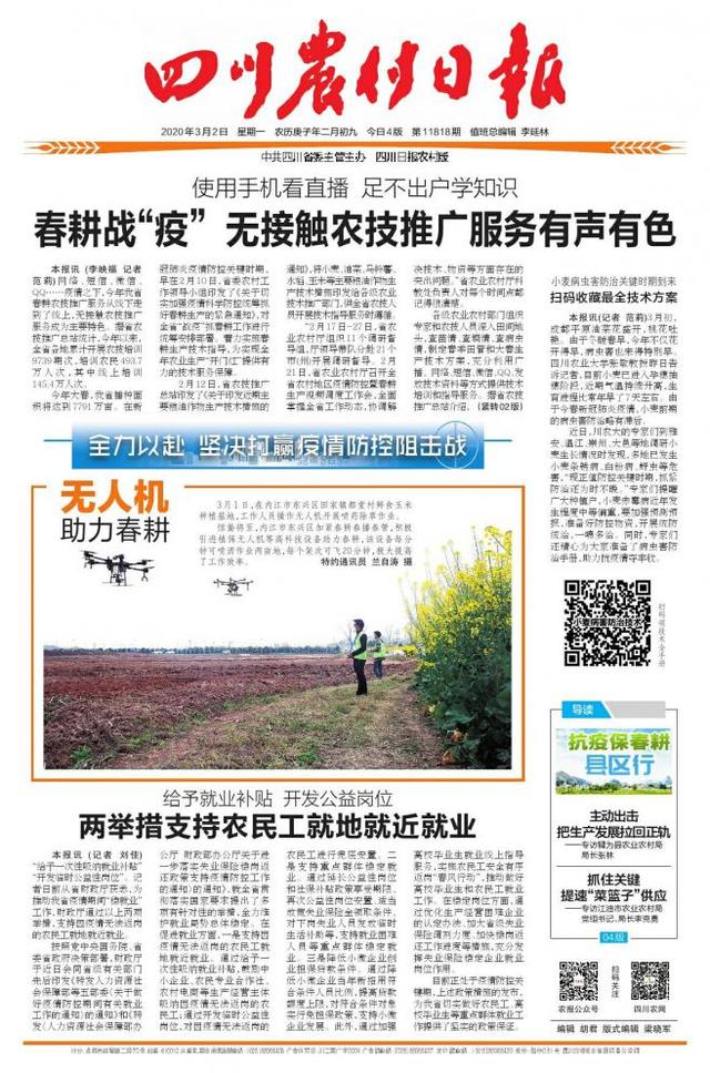3月1日,在内江市东兴区田家镇都堂村鲜食玉米种植基地,工作人员操作无人机开展喷药除草作业。 惊蛰将至,内江市东兴区加紧春耕春播春管,积极引进植保无人机等高科技设备助力春耕,该设备每分钟可喷洒作业两亩地,每个架次可飞20分钟,极大提高了工作效率。 特约通讯员 兰自涛 摄