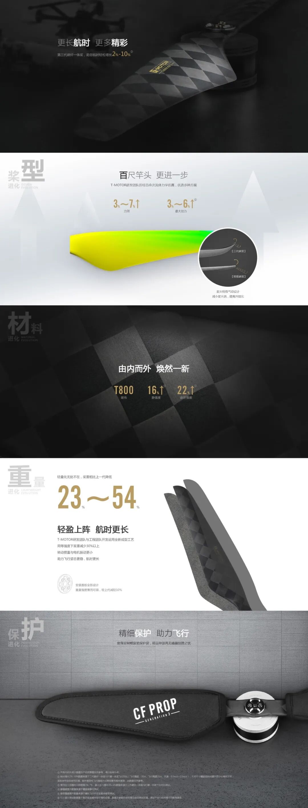 为了使飞机获得更长的航时,历经百余次力学流体力学仿真,多次高海拔地区测试,TMOTOR 推出了全新的第三代一体碳桨。采用了新型材料和全新成形工艺,使其有比前一代更轻的重量,更高的力效,更好的强度,助力您的无人机拥有更长的航时。