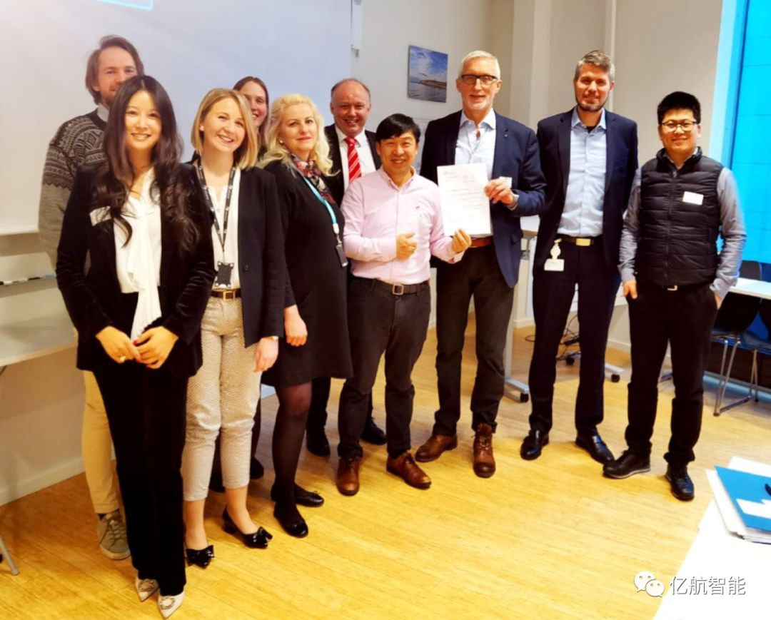 挪威民航局无人驾驶航空部门负责人Bente Heggedal(左三)与亿航智能创始人、董事长、CEO胡华智(左四)出席颁证仪式。