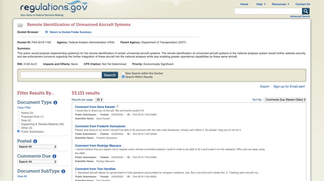 FAA要求无人机须连接互联网,更需订购私人供应商的管理服务,保存至少6个月的飞行纪录,令无人机用户需额外付出更多费用。大疆的新闻稿引用了NERA经济咨询公司董事总经理Christian Dippon博士的经济分析,指FAA拟定方案的无人机远程识别费用每月成本达9.83美元,而非FAA所称的每月2.5美元。如果按照FAA的建议实施的话,未来无人机的需求将会下降一成;而且未来十年总成本将达56亿美元,而非FAA估计的5.82亿美元。大疆促请FAA再重新考虑,让无人机用户可以选择不同的合法方案,而非只能选择FAA方案。 早前FAA展开为期60日的公众咨询,在今月3日截止,联邦公报网站上有超过53,000则留言评论,当中可以看到不少评论反对FAA的方案。