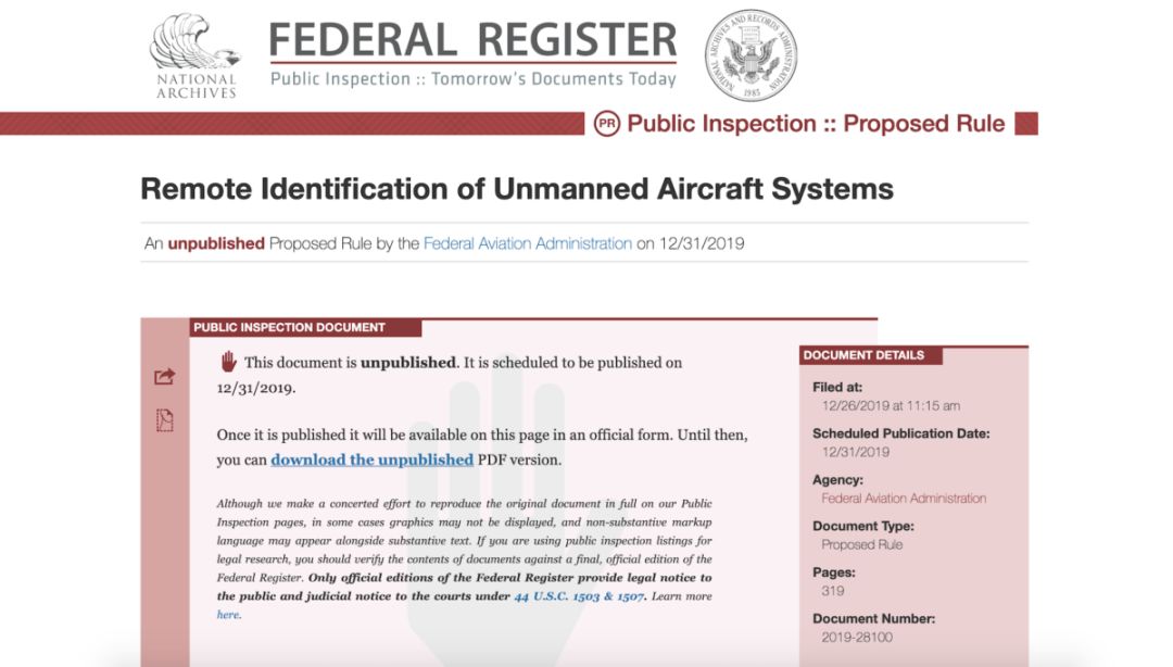 2019年12月,美国联邦航空管理局(FAA)提出一项拟议的新规定,要求无人机未来必须可被远端识别身份,才可在美国空域飞行。