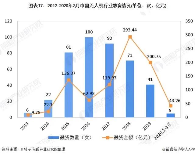 此外,从行业投资情况来看,2014年被称为中国“无人机元年”,彼时,无人机市场爆发,资本不断涌入,2016年无人机行业全年融资次数达到100次。而进入2018年,专业级无人机市场需求加速释放,消费级市场爆发式增长,全年融资次数为71次,融资金额达293.44亿元,较2017年大幅增长,更是有大疆10亿美元的大额融资。在资本的助推下,中国无人机行业发展如火如荼。2019年行业融资次数为41次,融资金额为200.75亿元,其中亿航智能于2019年12月12日在美国纳斯达克IPO上市,此次IPO融资金额为4000万美金,亿航也成为中国无人机行业第一股。2020年2月19日,中航金城无人机获得中航科工6658万元人民币的战略投资;2020年3月2日,微纳新空获得比邻创投领头的1亿元A+轮融资。前瞻产业研究院认为,未来我国无人机行业在政策和资本的双加持下,行业还将继续蓬勃发展。