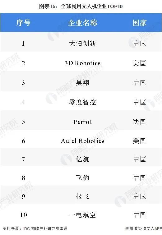中国的无人机行业的发展特别是民用无人机的发展走在世界前列,根据IDC的数据统计,大疆创新占据着全球消费级无人机市场70%以上的份额,在全球民用无人机企业中排名第一。