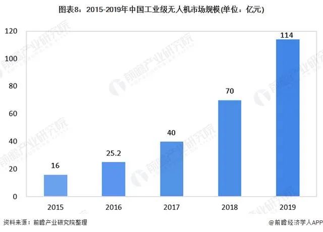 工业级无人机在此次疫情防控中发挥了重要的作用,其增长空间远超消费级无人机,是无人机行业发展的重点领域。2018年我国工业级无人机行业市场规模达到70亿元,同比增长率高达75%。2019年,我国工业级无人机行业市场规模约为114亿元,同比增长62.8%。