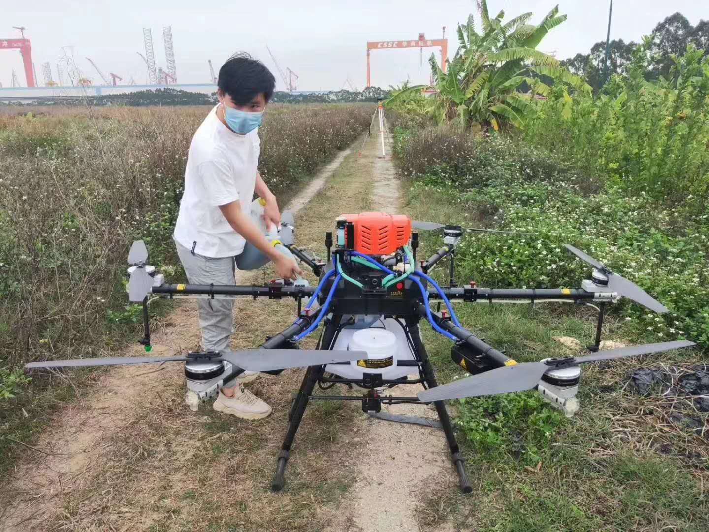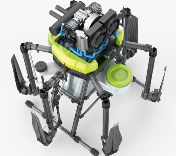 该款油电混合植保机配备了华科尔当下高强度、高耐力的双缸水冷发动机,同时先进的汽油发动机带发电机一体化动力电源技术,结合油动和电动的各项优势。从而保证了该机具备一颗强大的动力系统和持续可靠的动力输出。工作人员把提前备好的汽油直接加注到底部油箱,几十秒的时间即可完成。
