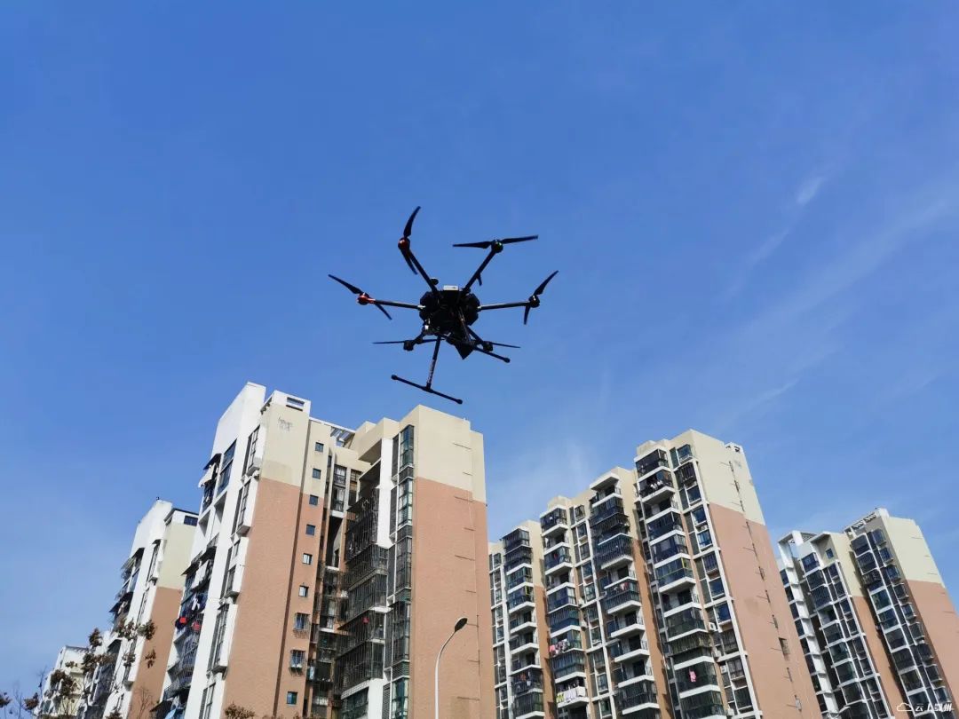 3月13日,在西山街道寒溪社区,一架无人机在空中盘旋,机载的高音喇叭不间断地向社区居民播放防疫和消防宣传提示。操作人员通过远程控制无人机飞行,可以清晰地查看地面建筑物分布情况和人员活动情况,为道路巡查和社区管控提供相应技术支持。