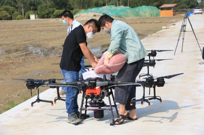 工作人员利用无人机直播丝苗米谷种