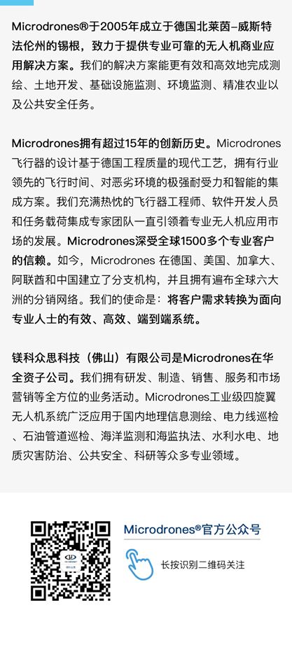 来自德国的Microdrones拥有超过15年的创新历史,一直致力于为商业市场提供飞行时间长、节省时间和成本、测量精确且无惧恶劣天气的无人机系统。
