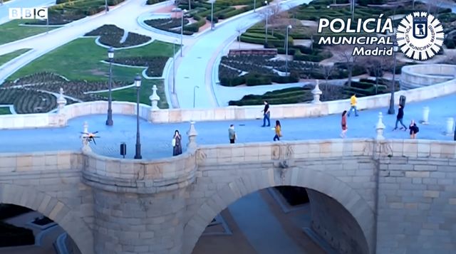 “卫生部门建议,请回家,离开公园”,英国广播公司(BBC)15日发布的视频显示,西班牙马德里警察在公园内利用无人机巡逻,并喊话要求公园内聚集的人群离开。