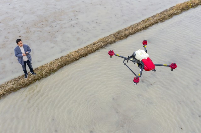 今年,项贤治计划利用无人机进行稻种直播,“只要把上面的喷药构件拆下来,换成喷洒稻种的套件,植保无人机就能变身播种无人机。”他说,传统的播种需要农户套上胶鞋,在水田里深一脚浅一脚地来回走,把稻种播撒下去。而利用无人机直播,农户无需走进田里,按照程序设置路径直播更均匀。