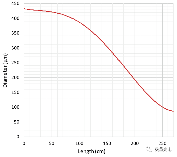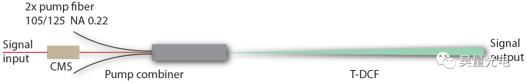 锥形双包层掺镱光纤(T-DCF)是一种纤芯芯径及包层随长度均匀变化的非常规光纤,大模场直径可达到100um,从而可使光纤激光器或放大器的非线性效应(SRS, SPM)阈值显著增加;具有更大包层吸收,通常可大于20dB,且同样增强非线性效应阈值;纤芯直径的调制,锥形光纤的宽端口(Wide side)与窄端口(Narrow side)可以保持通常的光束质量(M2<1.15)。总而言之,锥形双包层掺镱光纤的使用从各方面提高了光纤放大器的性能,势必促进全光纤超快激光器的快速发展。