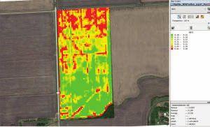 在最近的一个案例中,无人机在一天内飞越了好几片田地。到第二天下午,Berg使用这两个软件包处理NDVI地图,并创建变量施肥地图,以便在第二天施肥。地图中的红色部分显示了没有施肥的淹死玉米的区域。在南部(地图下半部分),即地图上排水较好的地区,该公司施用了更多的肥料以获得更好的产量。