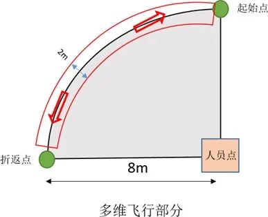 面向飞机练习:飞行器 P 模式下,操作飞行器由【起始点】起飞,沿地面弧线往返【折返点】 总共来回 4 次,最后回到【起始点】 。每次回到【起始点】 后则变换机头方向(与上一动作偏航 90°),依次为对尾、向左、对头、向右飞行,最后在【起始点】降落,时间在 100 秒内优秀(以图示区域大小为例);