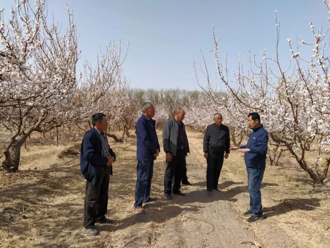 3月26日,在托克逊县郭勒布依乡奥依曼布拉克村村民买买提·艾尼苏力家的50亩杏园上空,一架无人机正在喷洒着花粉,附近村民闻讯赶来,向农业技术专家面对面请教授粉技术。