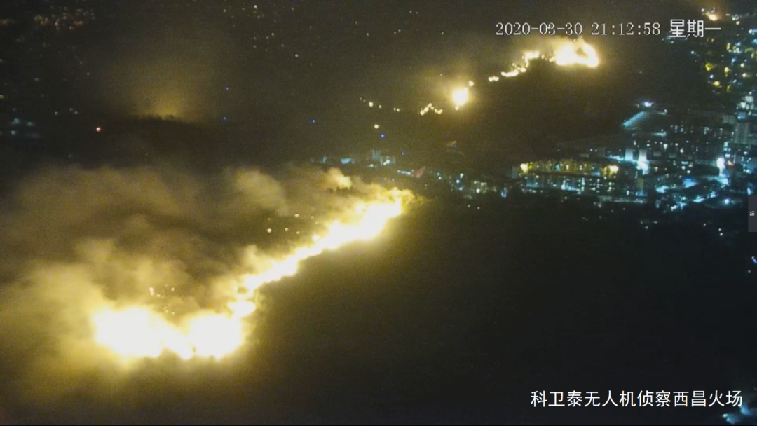 3月30 日夜间,科卫泰无人机保障小组抵达西昌城区火场附近,起飞无人机侦查火场火情,火场上空风力达7级左右,但科卫泰无人机仍能正常作业,充分展现了抗风能力强的特点。通过科卫泰无人机空中实时传回的图像,火线蔓延态势一览无余,为现场指挥人员精准研判火情、迅速部署扑火力量阻击火势蔓延提供了科学依据。对于重点设施场所,如250吨石油液化气储配站进行了空中侦查,通过无人机侦察显示,火场距离250吨油库仅600多米,指挥部迅速调集灭火人员对油库开辟防火隔离带进行保护,防止了火灾次生灾害的发生。