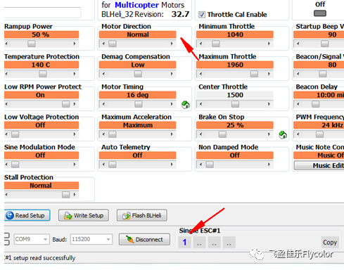 2、Motor Diection为电机的正反设置,把NORMAL切换到REVERSED就可以更改转向,设置1号电机便亮起1号,2号便亮起2号,1234同时亮起则为一起设置您更改过的设置。