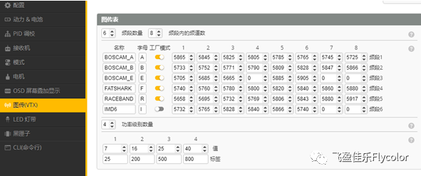 1.在图传栏目输入图传表,也就是频道,功率看你买的什么图传,功率的值可直接导入协议。