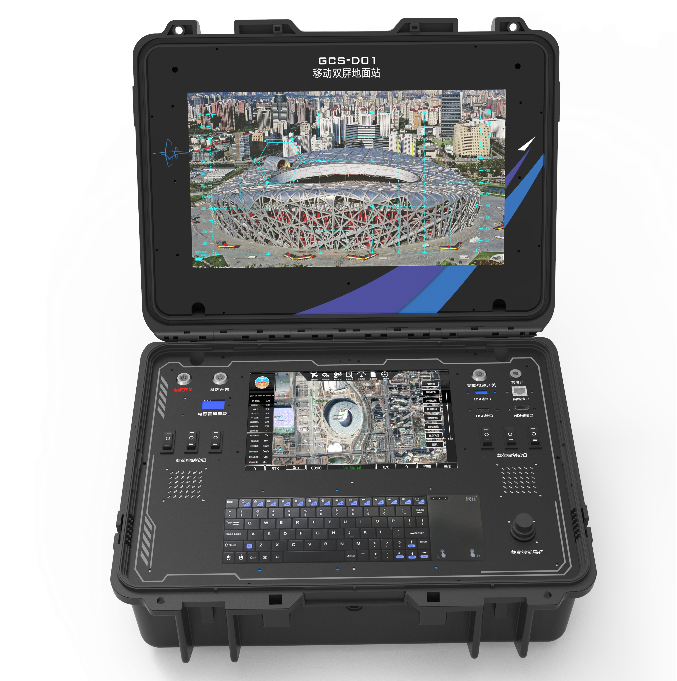 双屏地面站是用来显示无人机的飞行信息和载荷信息,并控制无人机和无人机载荷。其集成高性能主机、双显示屏、载荷控制设备、通信链路等。其具有以下特点。