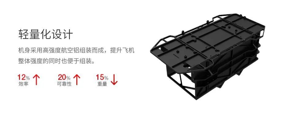 此飞行平台采用高强度的航空铝组装而成,减低平台重量的同时增加了强度且便于组装。