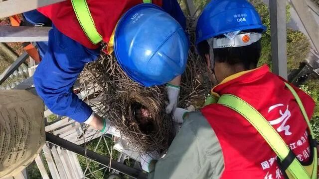 4月1日这天,国网杭州市萧山区供电公司输电运检人员吴雨泽和同事们做了一件特殊的工作,他们一起爬上了110千伏闻堰1174线3号电力铁塔,帮助在铁塔上筑巢的鸟儿“搬家”,把鸟巢安置到附近的大树上。