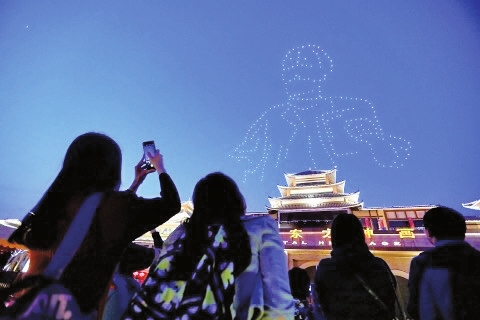 4月5日,济南方特东方神画上空星光闪闪,由景区组织的“致敬抗疫逆行者”无人机孔明灯秀的公益演出正在上演。