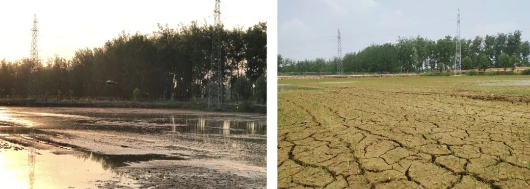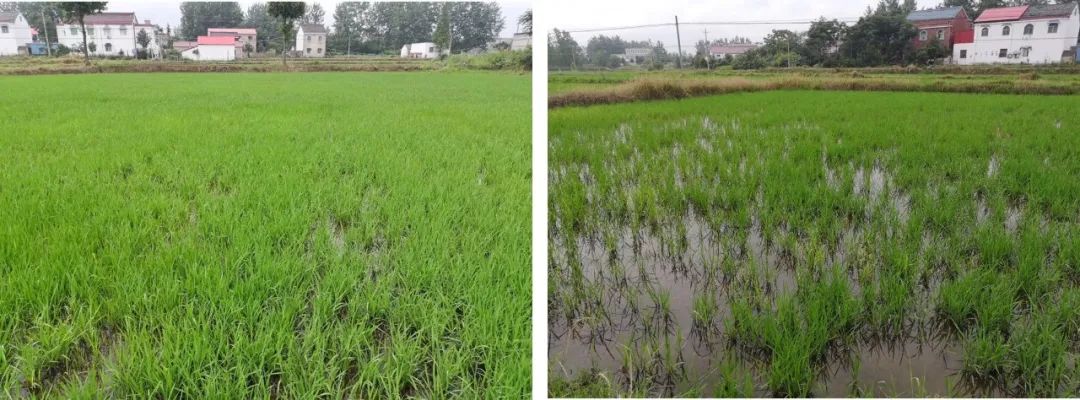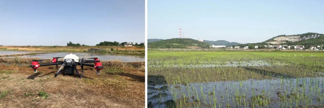 安徽霍邱水稻播种,左为极飞农业无人机播撒,右为人工播撒