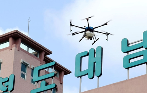 韩国庆尚北道清道郡Daenam医院,一架无人机正在向建筑物喷洒消毒剂。