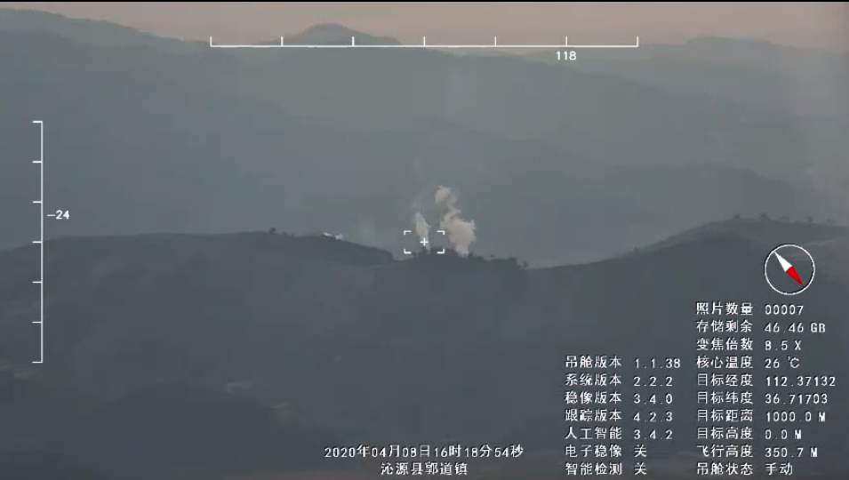 3VS无人机巡视机载端画面,无人机巡视中发现火情,迅速汇报坐标,救援人员迅速到达进行扑救,防止火灾扩大化。