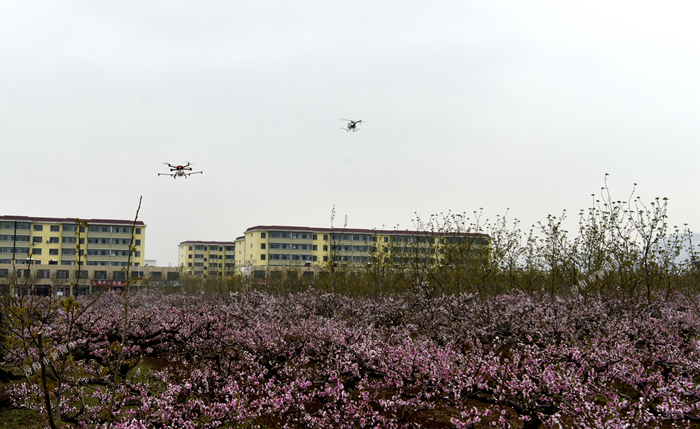 “嗡嗡嗡……”随着一阵阵轰鸣声的不断响起,两架携带着防冻液的无人机在果园上空对果树进行喷洒作业,从无人机上垂下的防冻液雾状“丝带”,轻轻拂过果树,为果树穿上了一层层“防护衣”。
