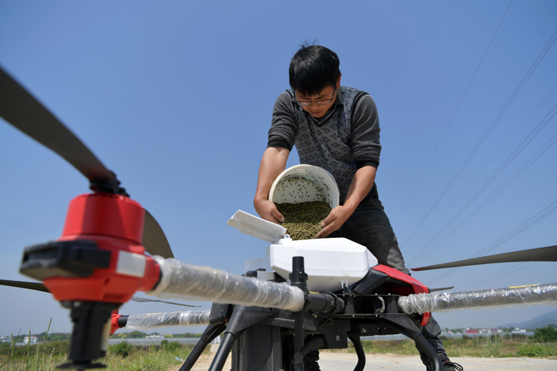 在江西省南昌市南昌县南新乡,当地农户将早稻种子倒入无人机的设备中,准备利用无人机进行播种(4月15日摄)。