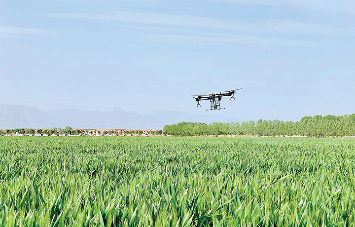 4月16日,在梨林镇桥头村的麦田里,植保无人机在田间喷药。记者 许艺馨 摄目前小麦进入抽穗扬花期,正是小麦赤霉病防治的关键时期,全区及早防治,为今年小麦...