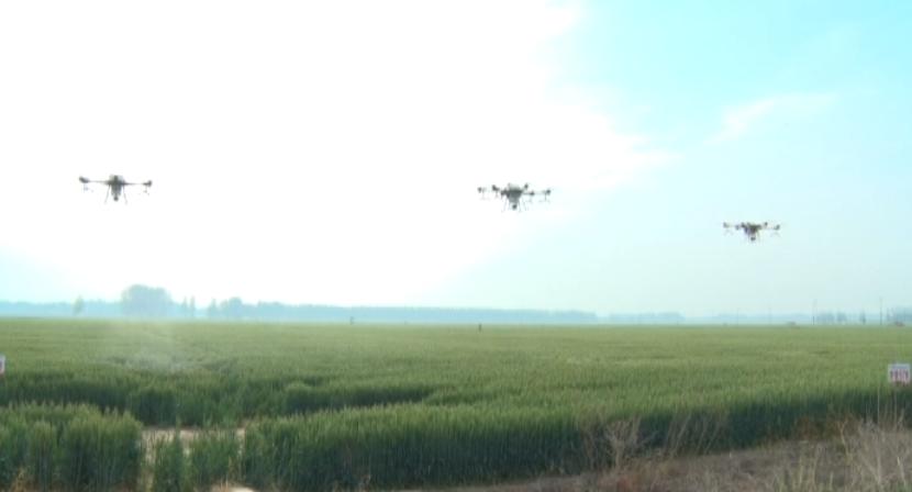 淮阳区豆门乡张集行政村 于井平:过去咱农民背着喷雾器打药,打几遍都打不好打不匀,现在高科技大型无人机喷药,站在地头就可以把整片地打完了,省时省力省工,喷的匀,打的又好。