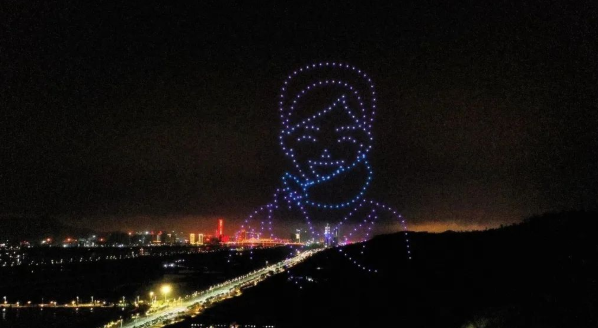 4月18日晚,无人机编队飞行了约10分钟,展示了"逆行者""摘口罩""护士捧心"等9个精心设计的画面,并有微博、看点进行现场直播。
