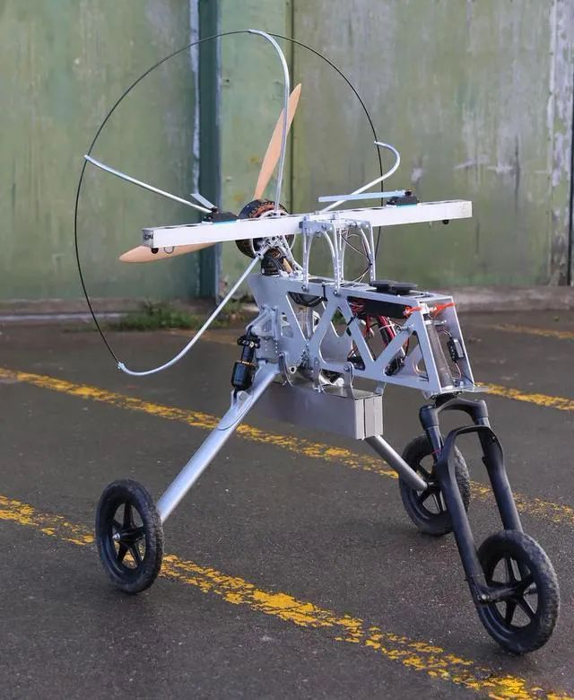 在空中飞翔时的Stork围绕一个管状金属框架建造,易于维修,它使用一个电动发动机推动后向螺旋桨,并配备了一个可折叠的伞翼。通过GPS信号进行远程控制,Stork的控制系统是一个黑盒子,两个小蘑菇形状的是导航系统的天线。