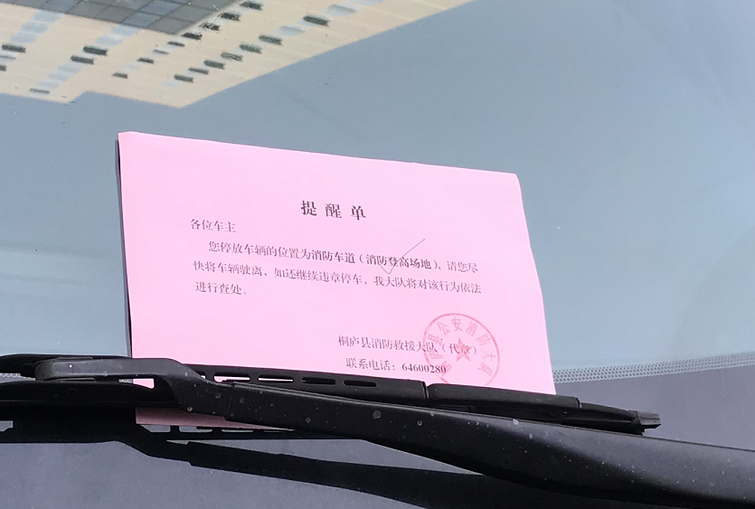 桐庐县消防大队救援工作人员对城区占用登高场地及消防车通道违停车辆发放了消防提醒单,希望车主能够提高安全意识,做到有序停车。