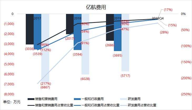 过去三年,亿航均处于年度亏损状态,净亏损率从 2017 年的 273.2% 下降至 39.4%,从费用情况可以看出,研发费用占营收比重从 217% 下降至 47% 为亿航节省了大笔费用支出,研发费用也是亿航 2019 年唯一同比下降的费用科目。