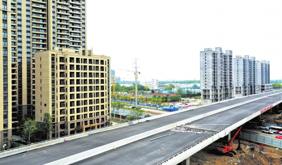 日前,无人机鸟瞰复兴大道荆州中至318国道桥面。复兴大道荆州中至318国道全长近4公里,其中设跨荆襄河段1座主桥、2座辅桥。目前,中国能建葛洲坝集团荆州市复兴大道工程项目三分部正加班加点安装防护栏等基础设施,桥下的路基和水稳层铺设也在同步进行,计划7月30日全部完工。(梅闻摄)